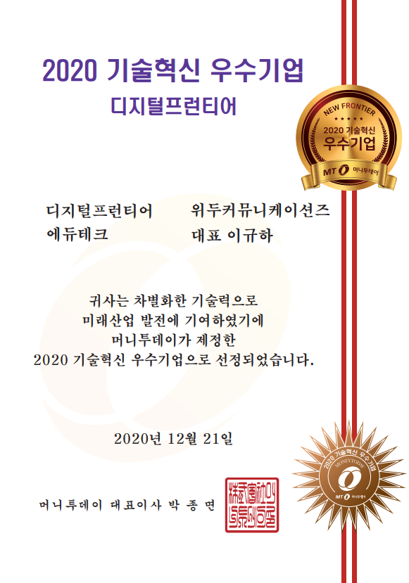 2020 기술혁신 우수기업 페이지 정보 작성자 WeDu 댓글 0건 조회 4,332회 작성일 21-12-31 12:58 본문 2020-12-21 2020 기술혁신 우수기업 디지털프런티어 에듀테크 머니투데이 대표이사 List Previous2020 소년한국 우수 어린이 도서 선정 21.12.31 Next2020 서울산업진흥원 2020 DMC어워드 21.12.31