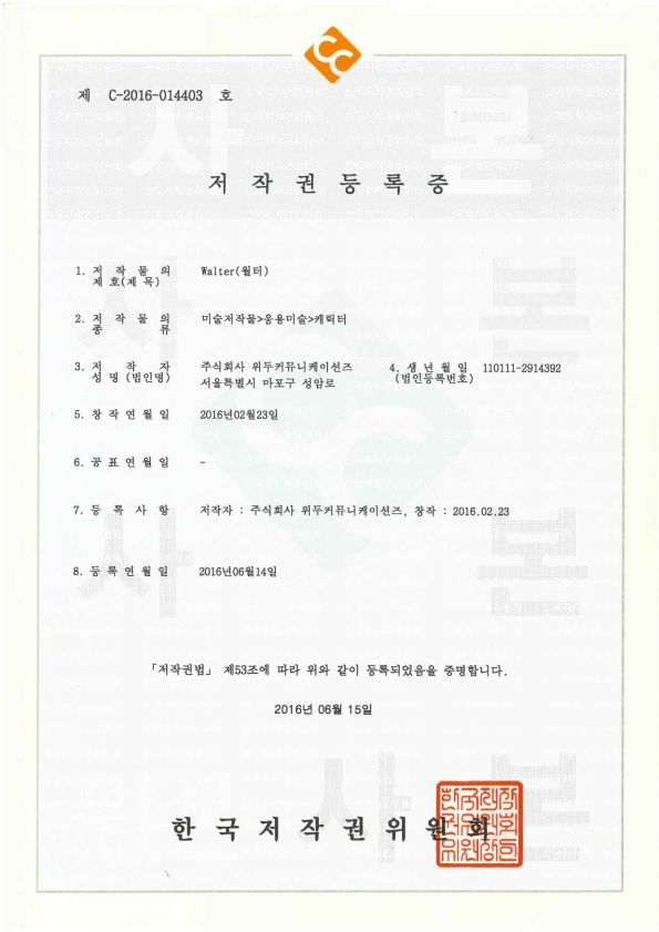 [한국/저작권] 월터 페이지 정보 작성자 WeDu 댓글 0건 조회 5,169회 작성일 19-05-30 19:09 본문 2016-06-15 저작권 C-2016-014403 월터 / 미술저작물>응용미술>캐릭터 List Previous[한국/저작권] 파벨 19.05.30 Next[한국/저작권] 필립 19.05.30