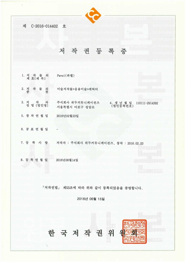 [한국/저작권] 파벨 페이지 정보 작성자 WeDu 댓글 0건 조회 4,470회 작성일 19-05-30 19:11 본문 2016-06-15 저작권 C-2016-014402 파벨 / 미술저작물>응용미술>캐릭터 List Previous[한국/저작권] 누미 19.05.30 Next[한국/저작권] 월터 19.05.30