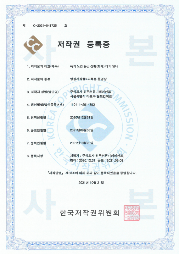 [한국/저작권] 독거 노인 응급 상황(화재) 대피 안내 페이지 정보 작성자 WeDu 댓글 0건 조회 4,595회 작성일 21-12-31 12:41 본문 2021-10-21 저작권 C-2021-041725 영상저작물>교육용 동영상 List Previous[한국/저작권] 장보기 인지훈련 게임 21.12.31 Next[한국/저작권] OLL KIDS/MATH 21.12.31