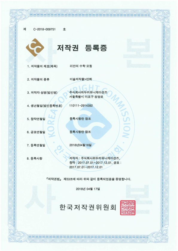 [한국/저작권] 리안의 수학 모험 페이지 정보 작성자 WeDu 댓글 0건 조회 5,110회 작성일 19-05-30 19:07 본문 2018-04-16 저작권 C-2018-009751 리안의 수학 모험 / 미술저작물>만화 List Previous[한국/저작권] 길리 19.05.30 Next[한국/저작권] 신입사원조기전력화 이러닝 콘텐츠 19.05.30
